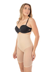 High Waist, Long Boy-Leg shaper provides tummy support via an ultra-fine fabric double-layered front panel. So light and smooth, you will not even know it is there. No unsightly bulges on front. Center seam in back blends into your natural anatomy, leaving no bumps or lines. Silicone strip at the waist keeps the garment in place while preventing slippage and dreaded roll-over. So comfortable you will not even know you are wearing shapewear